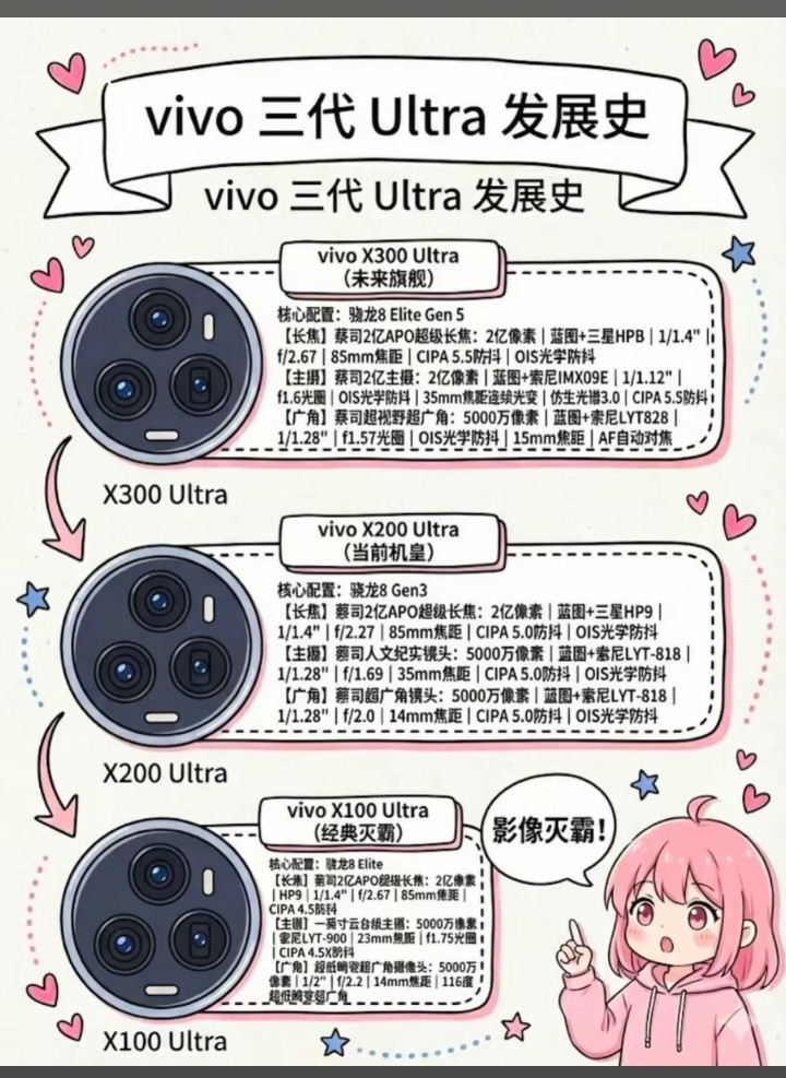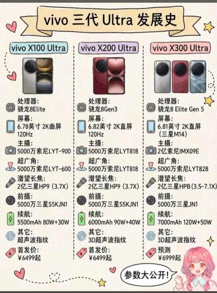 vivo三代Ultra旗舰手机的发展历程已通过参数对比图完整呈现,从X100 Ultra到X200 Ultra再到即将登场的X300 Ultra,每一款产品都在影像系统、屏幕素质、性能配置与续航能力等方面实现阶梯式升级。该系列作为vivo品牌高端战略的核心代表,始终聚焦于移动影像技术的突破与用户体验的极致优化。根据当前曝光信息,X300 Ultra预计将在2026年正式发布,起售价预测为6999元,延续前代产品的高规格定位,同时在多个关键维度带来全新进化。